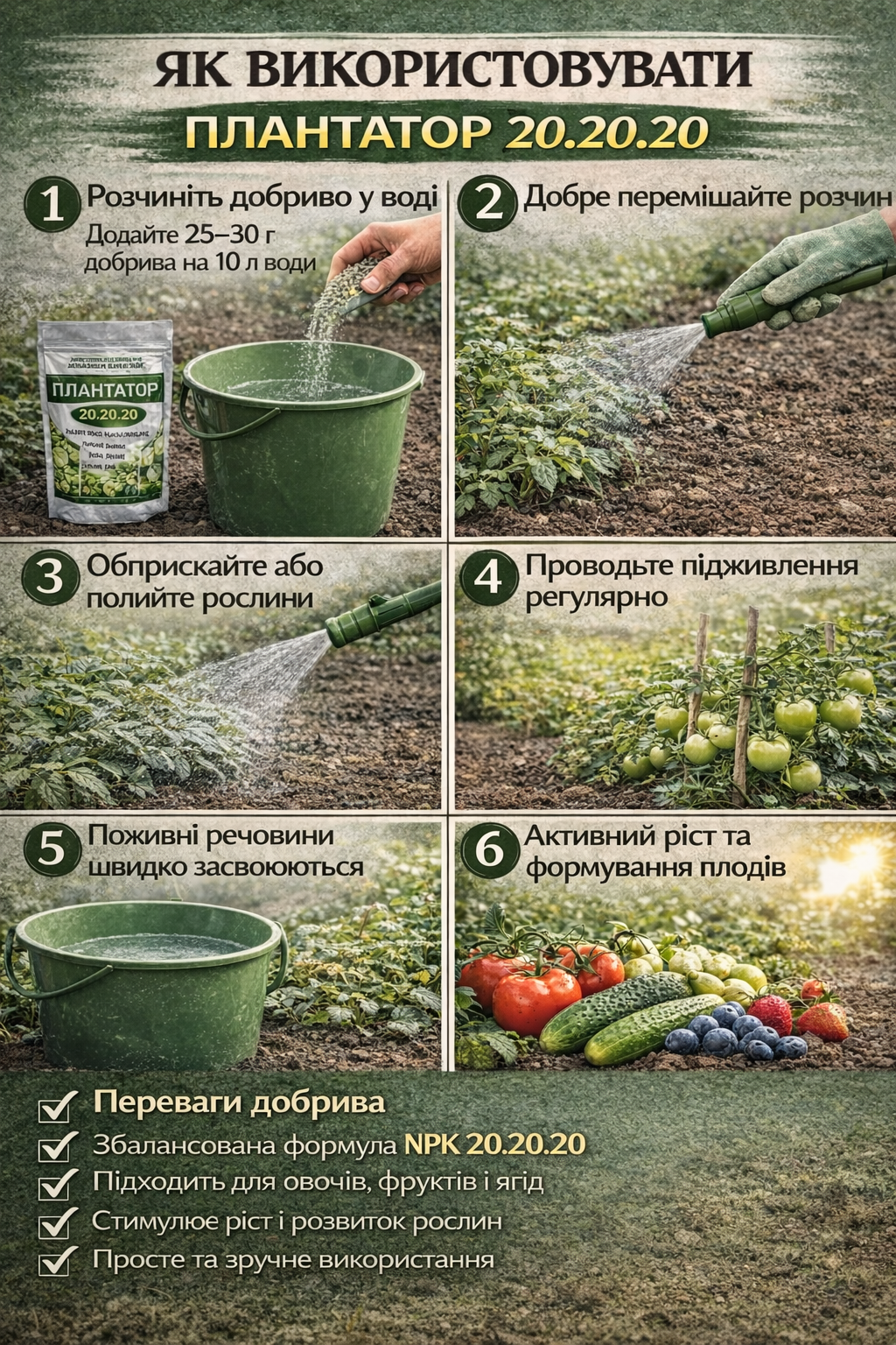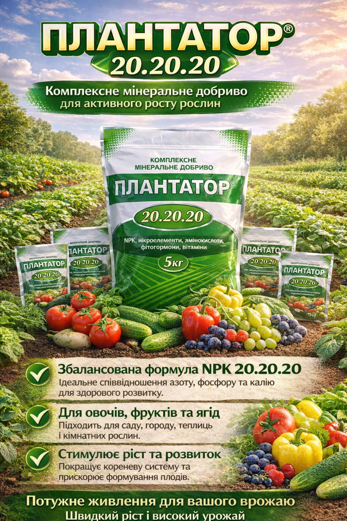 1️⃣ ПЛАНТАТОР 20.20.20 — комплексне мінеральне добриво для активного росту рослин. Забезпечує рослини поживними речовинами та сприяє швидкому розвитку.